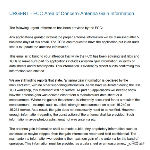 2022年8月25日,FCC发布最新公告,2022年9月1日起提交的所有FCC part 15 设备认证资料,必须包括实际天线增益信息。已经在FCC申请中的案件,必须补交天线增益信息后才可以进入发证阶段。对于之前已经取得FCC ID 认证的设备,FCC会进行排查后通知TCB机构。凡有收到FCC或TCB机构通知的申请人,需要于5个工作日内补交设备的天线增益信息,否则证书可能被取消。