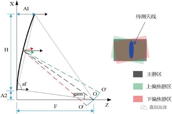 紧缩场多探头方法将多个探头布置于抛物面焦点附近。如图1 所示,偏焦后的探头可以在紧缩场原有静区附近形成与原静区有一定夹角的平面波,从而实现多个平面波入射角度的同时测量。探头扫描法可以显著提高紧缩场系统的测量效率,但是馈源偏焦后,天线口面的相位不再严格保持恒定,或者从馈源偏焦的位置经反射面到达天线口面的总光程与y 不完全保持直线关系,因而会增加某些误差。