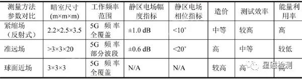 紧缩场是在5G天线测量中唯一能够在近距离直接实现远场测量的场地,由于5G(基站)天线的射频端口不开放,传统采用以矢量网络分析仪为核心的测量S 参数获取方向图的方法不再适用。如果天线电尺寸很小,远场距离很容易满足,则传统的球面近场扫描、准远场暗室等方案也可以通过OTA方法测量获得天线辐射方向图。但是,在天线电尺寸较大时,满足远场距离的长度较长,测试成本高昂。传统的天线测量方式有多种,每种方法都有各自最为适用的环境,5G天线测量与传统天线测量方法有相似点但是又有很多独特之处。本文以覆盖0.8m测试区域,频率覆盖3.4~3.6GHz、4.8~5.0GHz、24.75~27.5GHz 以及37~42.5GHz等我国IMT-2020 发布的5G频段范围为例,表3 对各主要天线测量手段进行了分析。